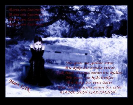 Ne güzeldir sevdiğinin gözlerine bakabilmek... Ne güzeldir gelişiyle coşup, gidişine yanmak... Ne güzel şeydir aşka aşık olmak...ruhum bedenimden ayrıldığında...ellerim ayazlarda kaldığında... aşkın hep bende yaşayacak...Şimdi bir şarkı söyleniyor, uzaklarda... Ne güz ne güllere sığar, bu kalp bir sende titrer... Yak hadi durma, senin bu küller... Ne yazı ne kışı bekler,bu kalp bir seni özler... Vur hadi durma senin bu izler... Bana sen lazımsın... Gözlerimin limanı oldu gözlerin... Kirpiklerin gardiyanım... Ağlamasınlar söyle...ben hiç gidemedim ki..!